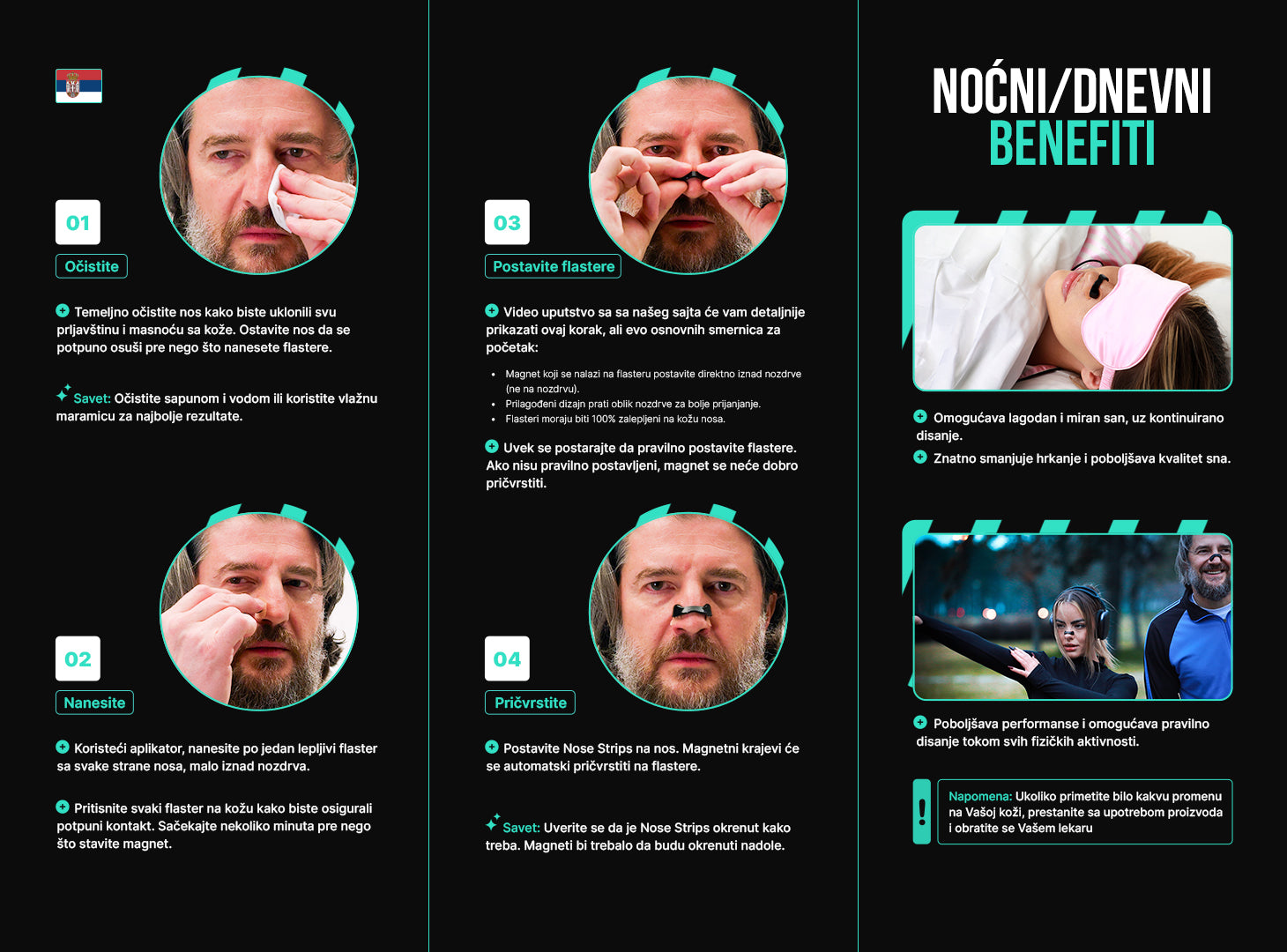 Nose Strips je inovativno rešenje za poboljšanje disanja, dizajnirano za osobe koje imaju problema sa začepljenim nosom, hrkanjem ili otežanim protokom vazduha kroz nos. Set sadrži 4x različite veličine Nose stripsa i 30x samolepljivih flastera sa magnetima, koji zajedno rade na otvaranju nosnih prolaza i poboljšanju disanja.